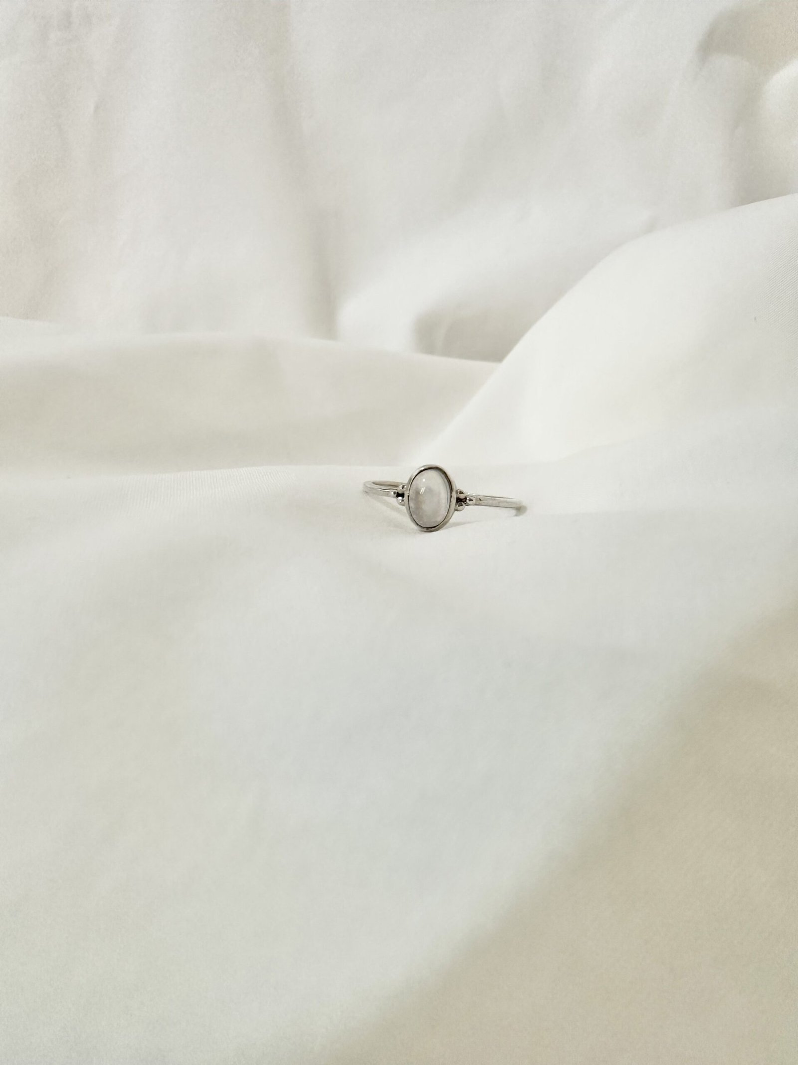 Anillo en plata 925 con piedra de la luna, detalles en los costados , formando 3 bolitas de plata.