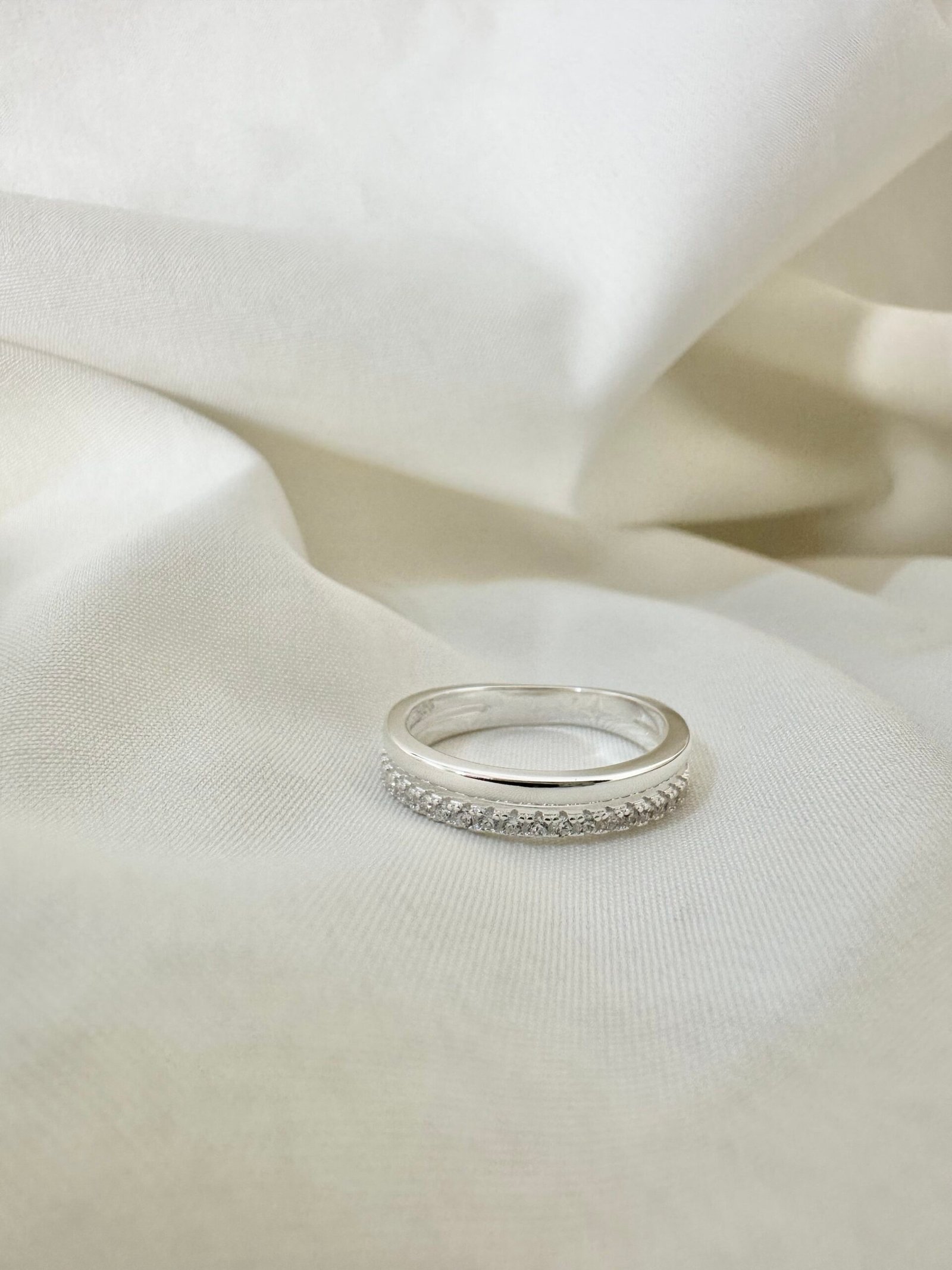 Anillo en plata 925 con una franja lisa y una franja con circonias, talle en mm internos.