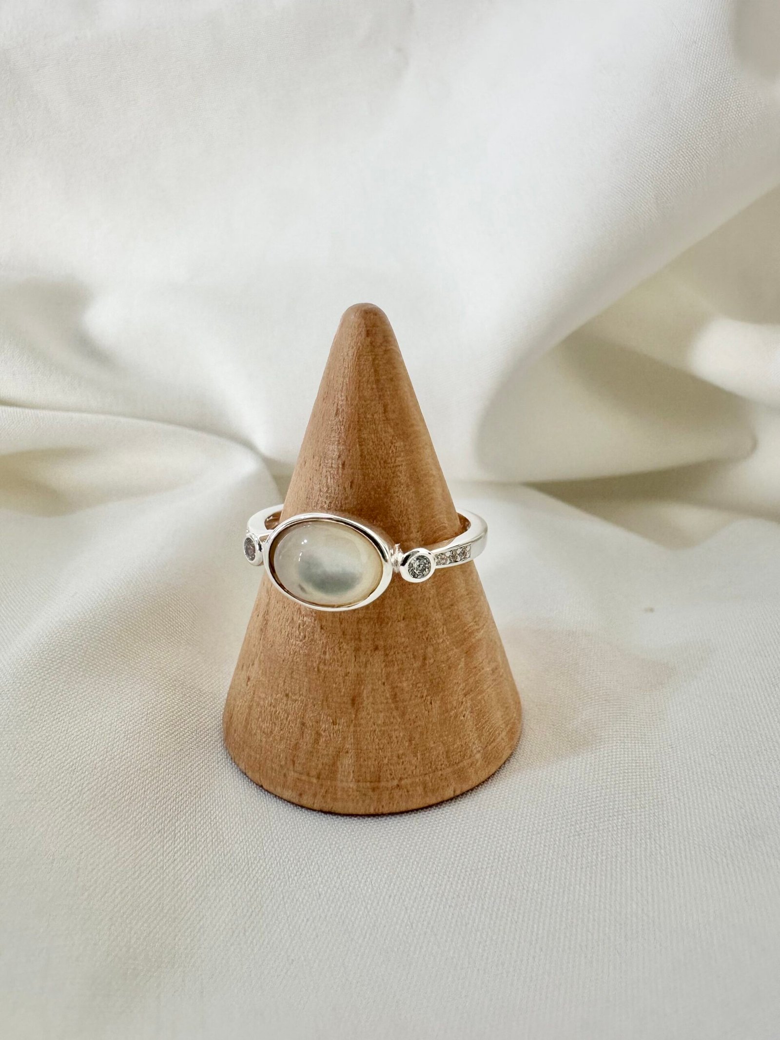 Anillo en plata 925 con nacar bomba y piedras a los costados. Talle en mm internos