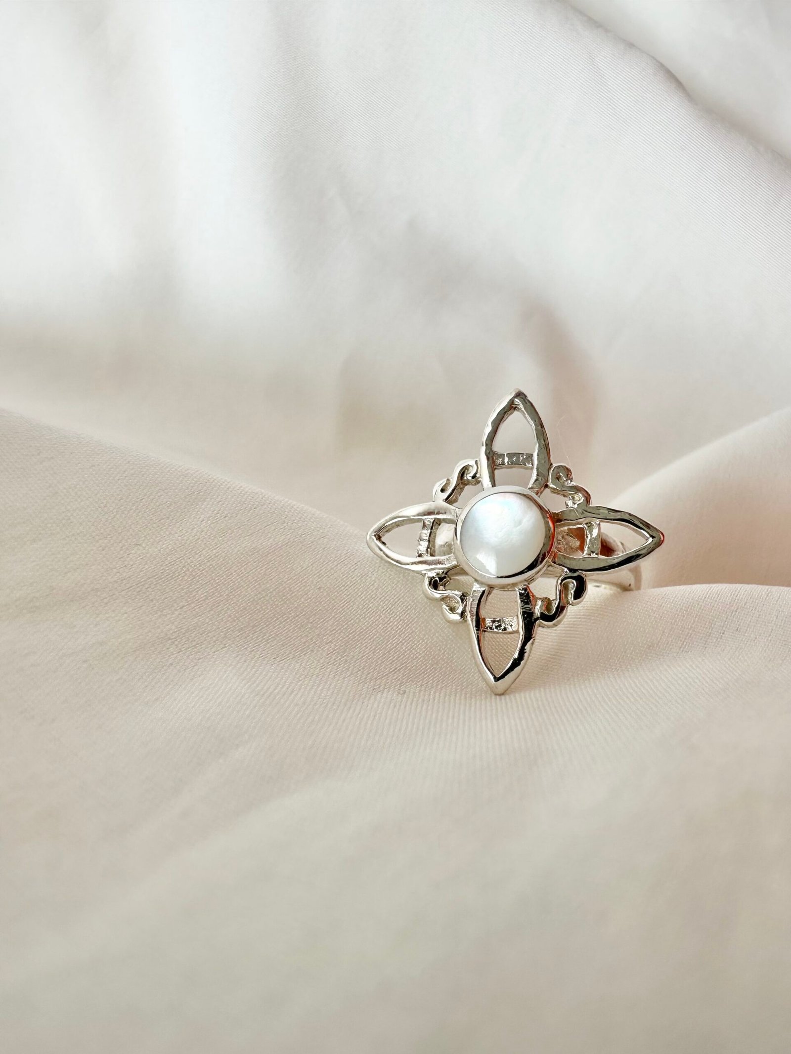 Anillo nudo de bruja en plata 925 con piedra central en nacar. Talle en mm internos