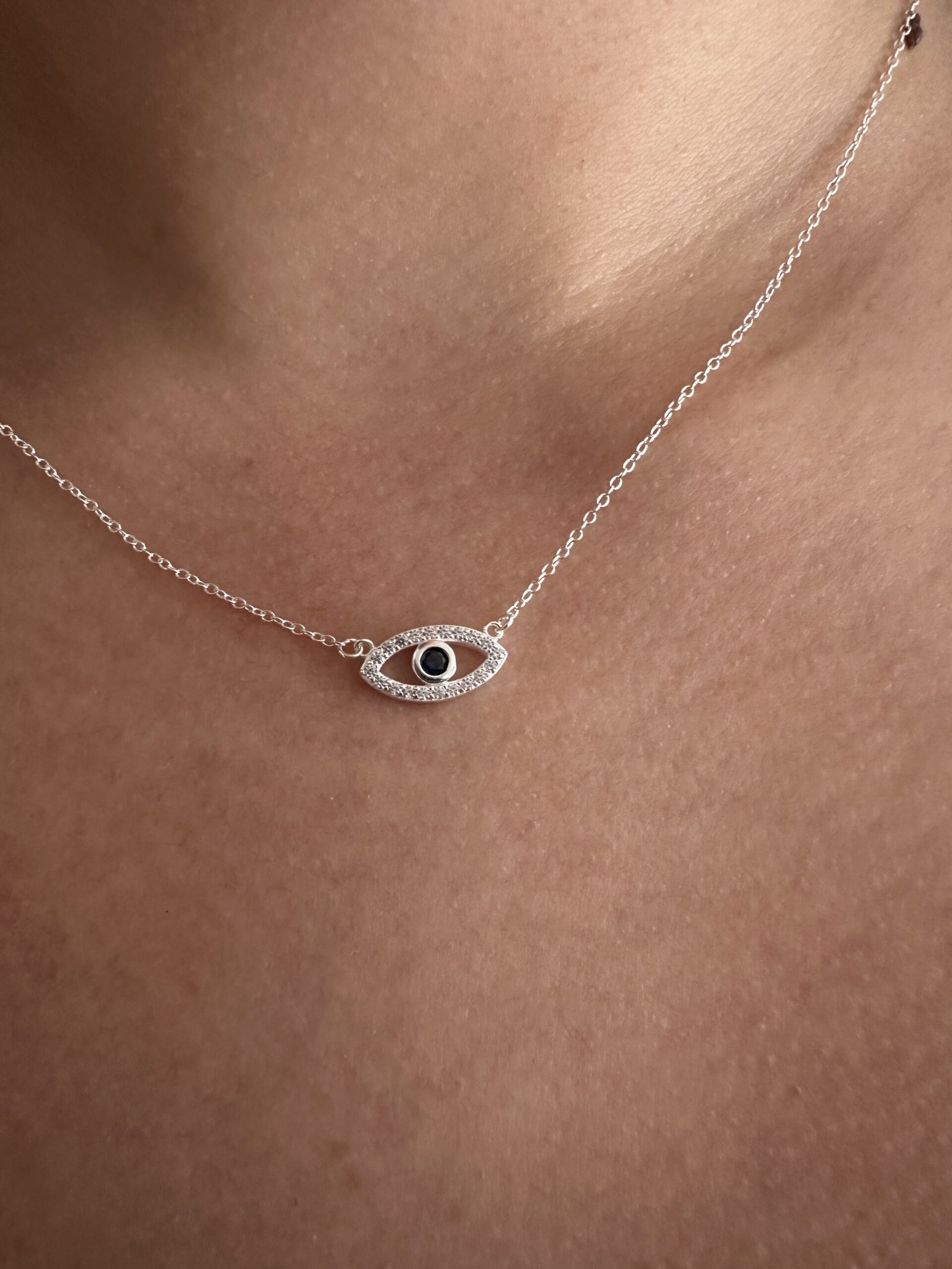 Conjunto en plata 925, con dije en forma de ojo , circonias del color blanco y en el centro de color azul, largo de la cadena 40cm o 45cm.