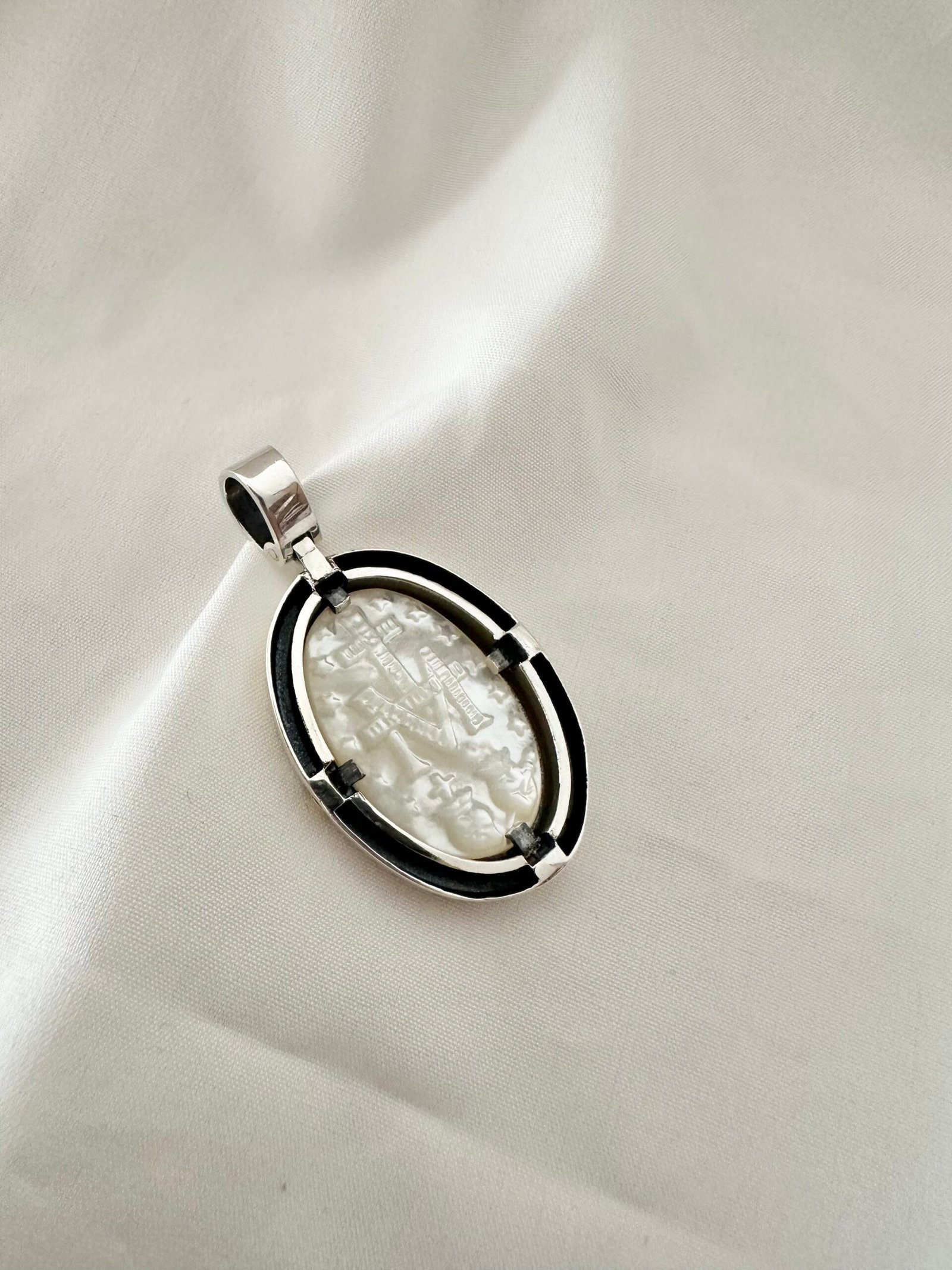 Dije Virgen en nacar , plata y oro.